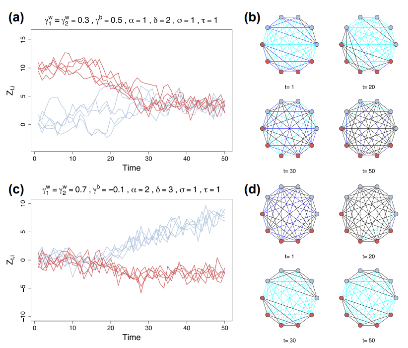 To study how the forces within and between groups (of people, e.g., democrats/republicans) lead to different patterns of people connecting, we construct a new class of statistical models called "Co-evolving Latent Space Network models with Attractors" or CLSNA. Its a mouthful, but the idea is simple. Every person is situated in a 2D space that we don't see and their position in that space evolves. Their connections with others (the network) also evolves, so its a co-evolving model. We introduce some attractors into the space that can pull/push people toward/away. By using different attractors for people in the same and different groups, we can explore how different regimes of the model lead to either flocking (groups pulling together and connecting) or polarizing (groups pushing apart and disconnecting).