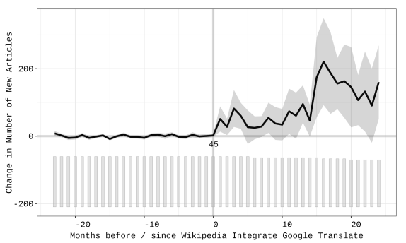Language barriers prevent people from accessing knowledge on online knowledge platforms like Wikipedia. Can advances in machine translation (MT) (that leverage machine learning and AI) help make knowledge more accessible? We look before and after the time that Wikipedia introduced Google Translate (a sophisticated machine translation tool) and find that it has a huge impact on pages produced in new languages. The effect isn't equal across all categories, culture and geography related pages get created more (via editor-assisted MT) . Interestingly, editors seem to use MT to narrow some systemic gaps in knowledge across gender and geography relative to pages produced by means other than machine translation.